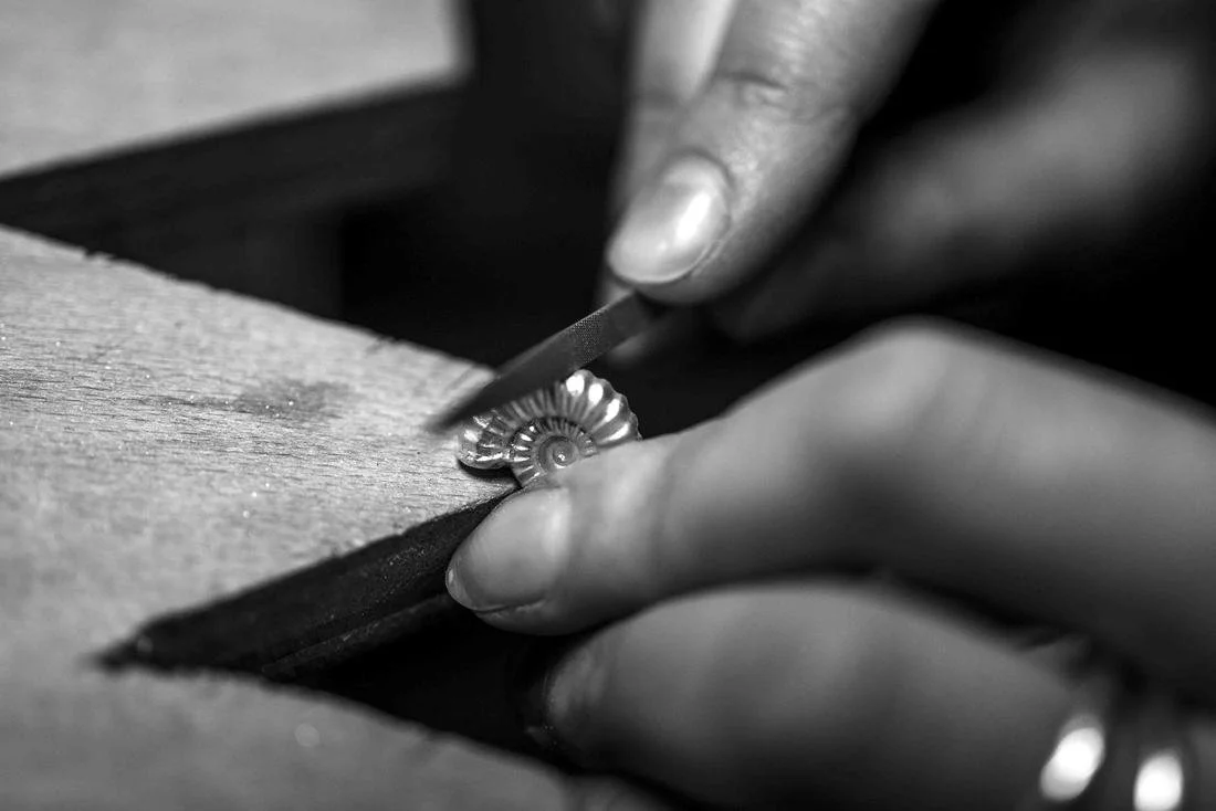 Silversmith and jeweller, Lucy Campbell, takes inspiration from the coastal landscape around Lyme Regis and the stunning Jurassic Coast. Delicate, circular forms are a recurrent theme, with shells, fossils and other seashore and organic textures appearing throughout her jewellery collection. Her work has a contemporary handmade look, with the ‘maker’s mark’ left beautifully visible. Lucy’s collections involve techniques such as forging, casting, etching, stone-setting and ‘precious metal clay’ and includes rings, bangles, bracelets, cuffs, earrings, studs, necklaces, pendants and cufflinks.